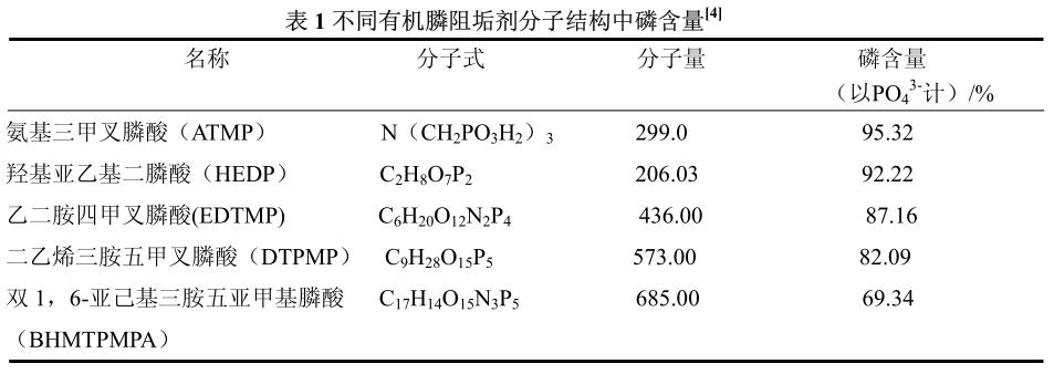 大分子有機(jī)膦阻垢劑分子結(jié)構(gòu)中,由于增加了-CH2-,分子量隨之增大,相對(duì)磷含量明顯降低;在-CH2-增加的同時(shí),分子結(jié)構(gòu)中起關(guān)鍵阻垢作用的-PO(CH)2基團(tuán)數(shù)量增加,阻垢性能得到顯著增強(qiáng)。不同有機(jī)膦阻垢劑分子機(jī)構(gòu)中磷含量見(jiàn)表 1。