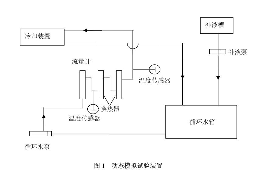 先在循環(huán)水箱中注入試驗(yàn)用水,按加藥劑量加入試驗(yàn)用阻垢劑,攪拌均勻;再在補(bǔ)液槽中加入已按加藥劑量配置的試驗(yàn)用水;開(kāi)啟動(dòng)態(tài)模擬試驗(yàn)裝置總電源開(kāi)關(guān),開(kāi)啟循環(huán)水泵,調(diào)節(jié)流量計(jì)閥門(mén),使循環(huán)水流量為 1000L/h;流量穩(wěn)定后,開(kāi)啟換熱器冷卻水閥門(mén)及換熱器加熱開(kāi)關(guān);設(shè)定循環(huán)水箱溫度為