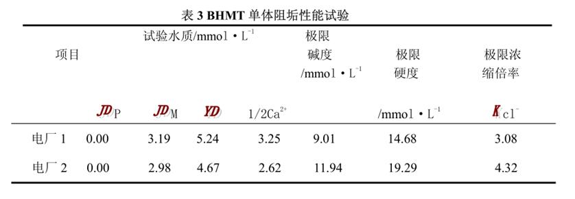 分別在選用的兩水樣中加入 BHMT 單體 6mg/L(按產(chǎn)品計(jì))進(jìn)行阻垢性能試驗(yàn),試驗(yàn)用水水質(zhì)及試驗(yàn)結(jié)果見(jiàn)表 3。