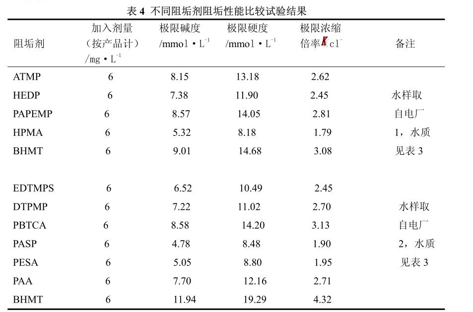 在選用的兩水樣(水質(zhì)見(jiàn)表 3)中分別加入 BHMT 及其它阻垢劑 6mg/L(按產(chǎn)品計(jì))進(jìn)行阻垢性能試驗(yàn),結(jié)果見(jiàn)表 4。