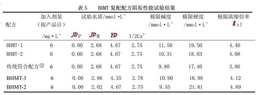使用的有機(jī)膦類(lèi)阻垢劑(ATMP、HEDP) 、羧基磷酸阻垢劑(PBTCA) 、聚合物分散劑、共聚物分散劑中的一種或多種阻垢劑。3 個(gè)符合配方(以下簡(jiǎn)稱(chēng) BHMT-1,BHMT-2,BHMT-3)的 BHMT-1 中 BHMT含量較高, 約為 50% (質(zhì)量百分比, 下同) ; BHMT-2、 BHMT-3 中 BHMT 含量較低, 為 20%~30%; BHMT-1,BHMT-2,BHMT-3 中其它阻垢劑共 20%~50%;BHMT-1、BHMT-2、BHMT-3 固體含量相同,均約為 35%。試驗(yàn)用水仍取自所選的 2 個(gè)火電廠(chǎng),但由于季節(jié)影響,同一水源水質(zhì)較表 3、表 4 有所變化。試驗(yàn)結(jié)見(jiàn)表5
