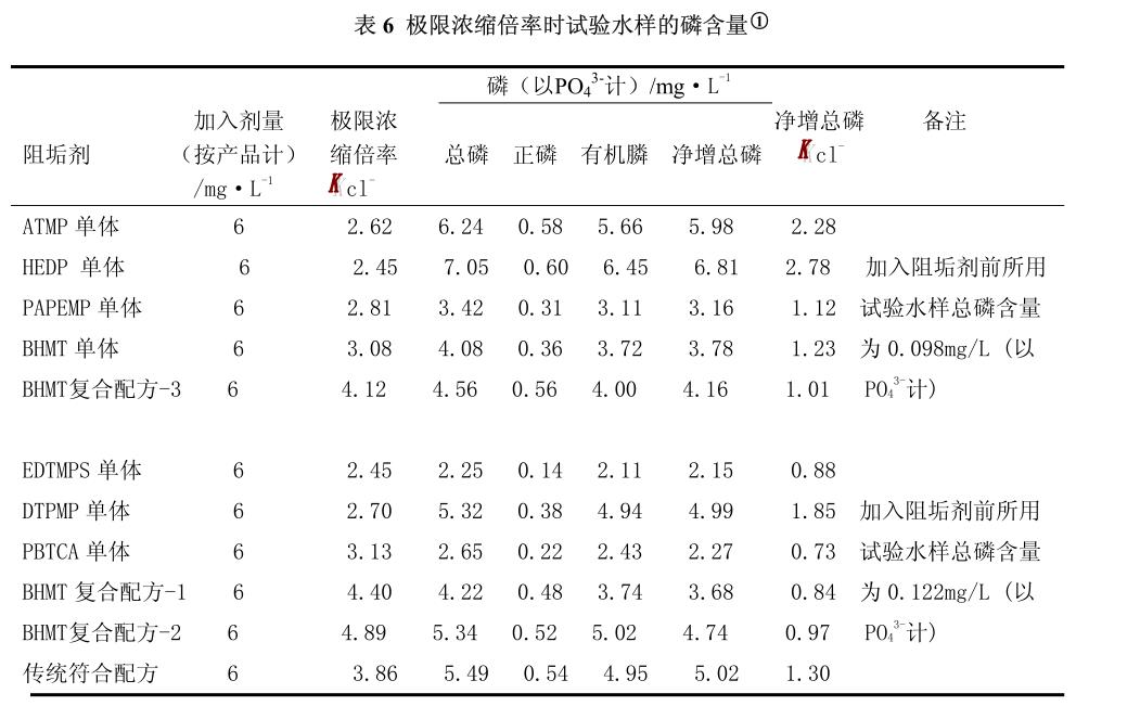 1.23mg/L(以PO 43- 計(jì)) ,與低磷阻垢劑PAPEMP相當(dāng),約為傳統(tǒng)有機(jī)膦阻垢劑ATMP、HEDP的 50%。復(fù)配配方中采用BHMT,濃縮倍率每提高 1.0 磷含量增加值較傳統(tǒng)有機(jī)膦復(fù)配配方降低 30%~50%。